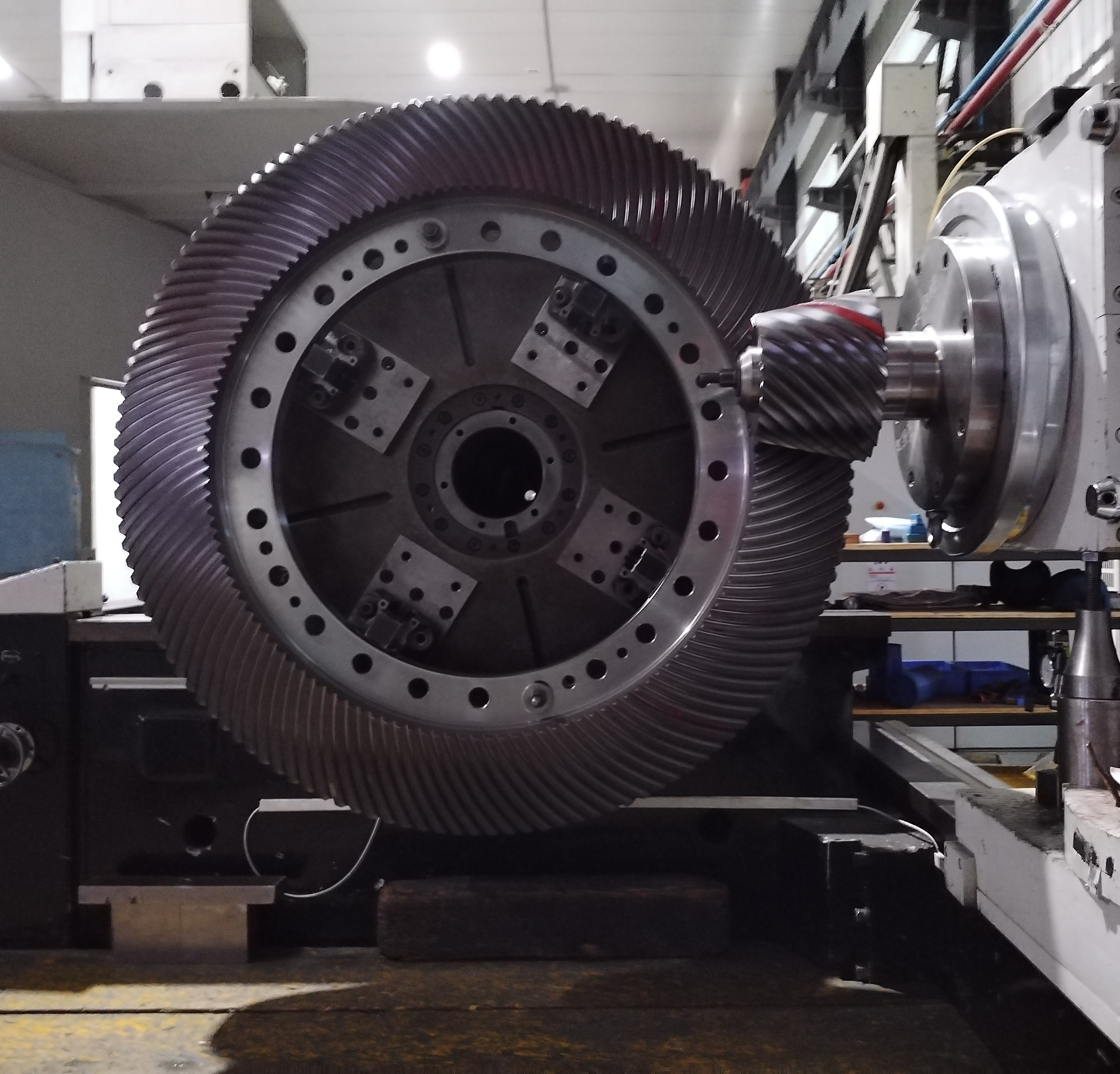 該齒輪直徑1450mm, 采用準雙曲面齒制。為了降低噪音,采用加大齒寬、大偏置距設計,增加了重合度。錐齒輪并非越寬越好,為了解決加大齒寬帶來的加工、嚙合等問題,對齒輪副采取LTCA分析,對系統用Romax進行動力學分析,同時利用滾檢著色進行修形反調等技術,保證傳動嚙合的可靠性。該項目的成果研制,代表著我司錐齒輪設計、加工技術進入了深入研究的階段。為大偏置距大尺寸準雙曲面齒輪加工奠定了基礎,也為超齒寬低噪聲錐齒輪的應用積累了設計和加工經驗。